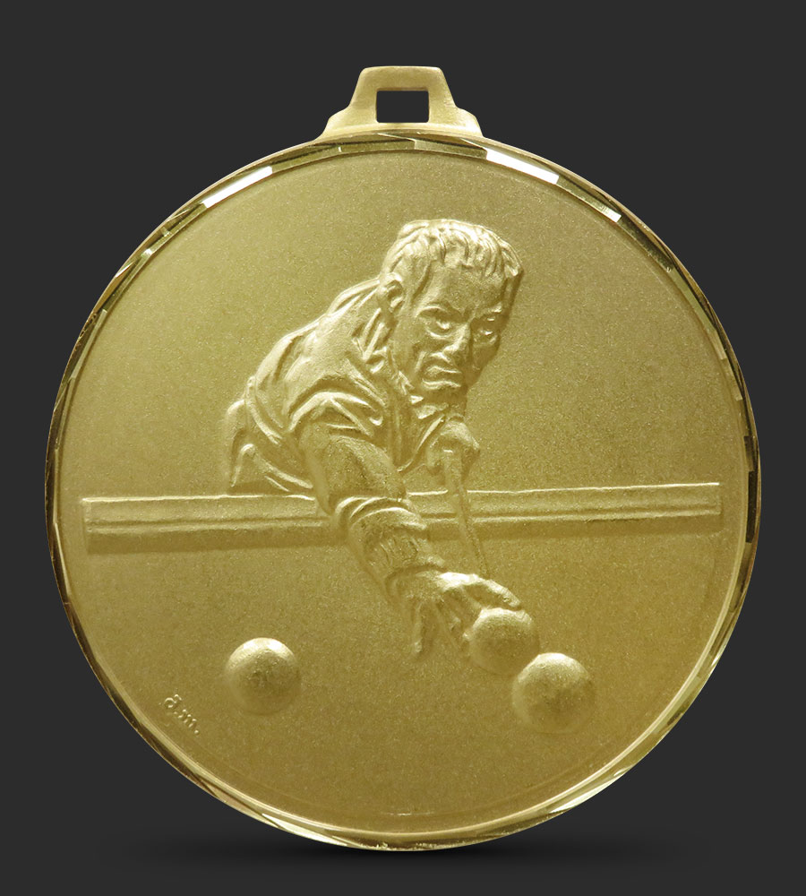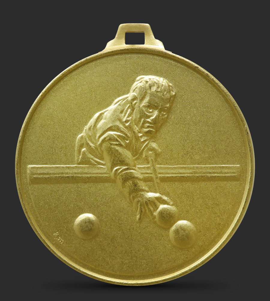 An intricately embossed Snooker medal depicting a snooker player lining up a shot.
