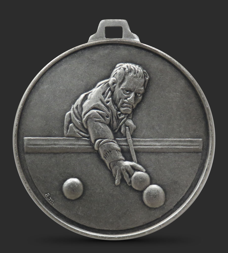 An intricately embossed Snooker medal depicting a snooker player lining up a shot.