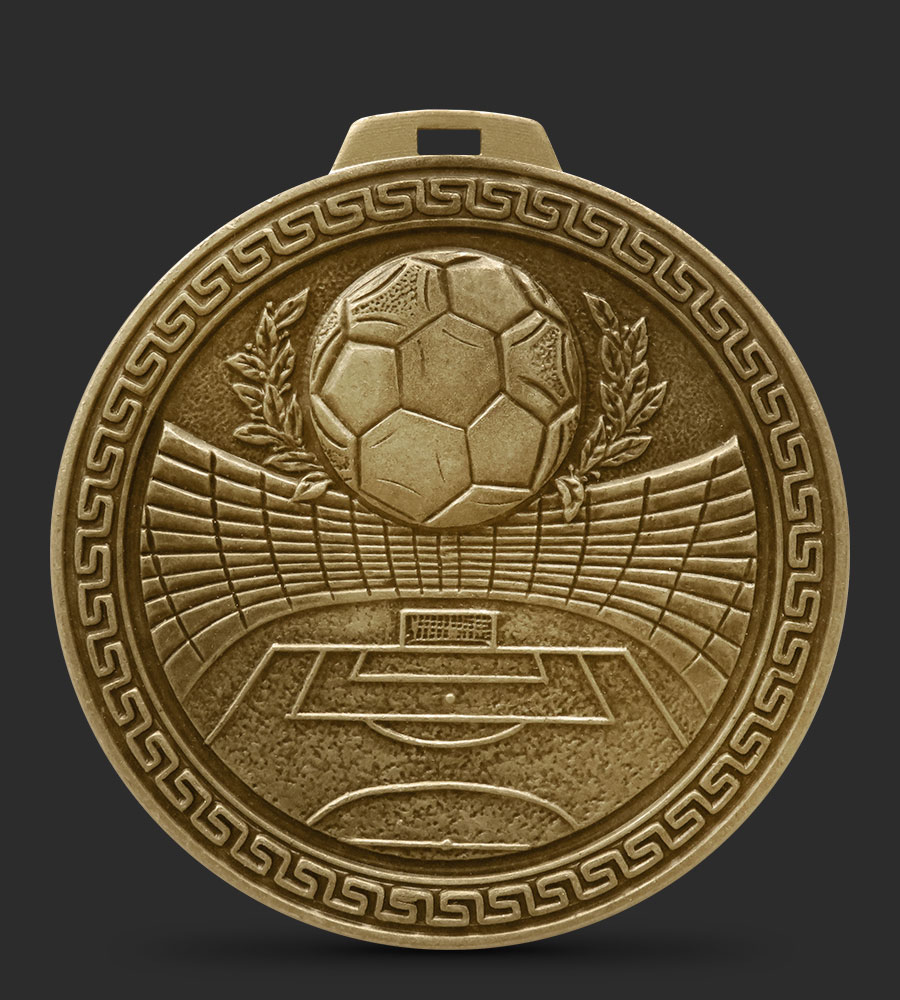 An intricately embossed Football medal depicting a football surrounded by laurel leaves, with football stadium in the background.