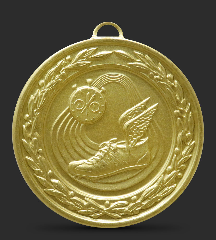 An intricately embossed Athletics medal depicting a winged running shoe, stopwatch and racetrack, with a laurel border around the edge of the medal.