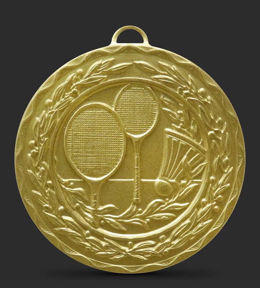 An intricately embossed Badminton medal depicting two badminton rackets and a shuttlecock with laurel leaves, with a laurel border around the edge of the medal.