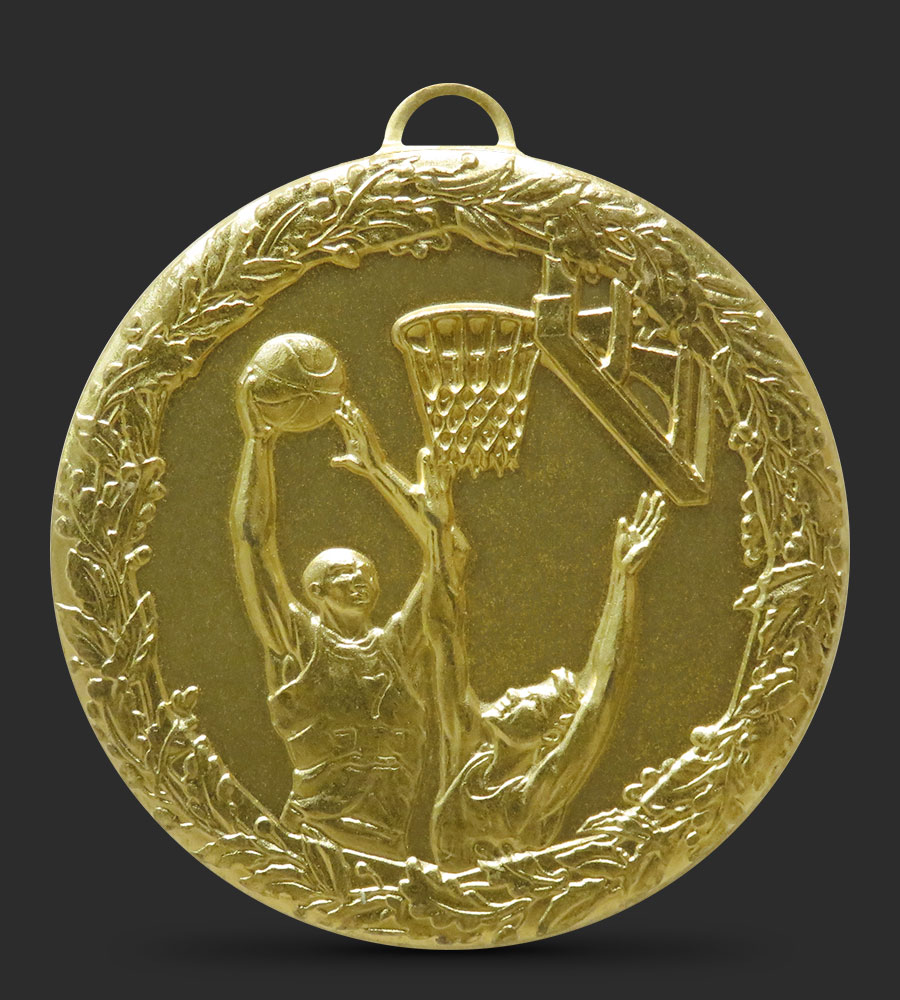 An intricately embossed Basketball medal depicting basketball players jumping up at a net, with a laurel border around the edge of the medal.