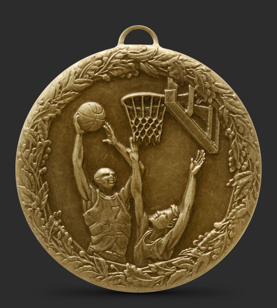 An intricately embossed Basketball medal depicting basketball players jumping up at a net, with a laurel border around the edge of the medal.