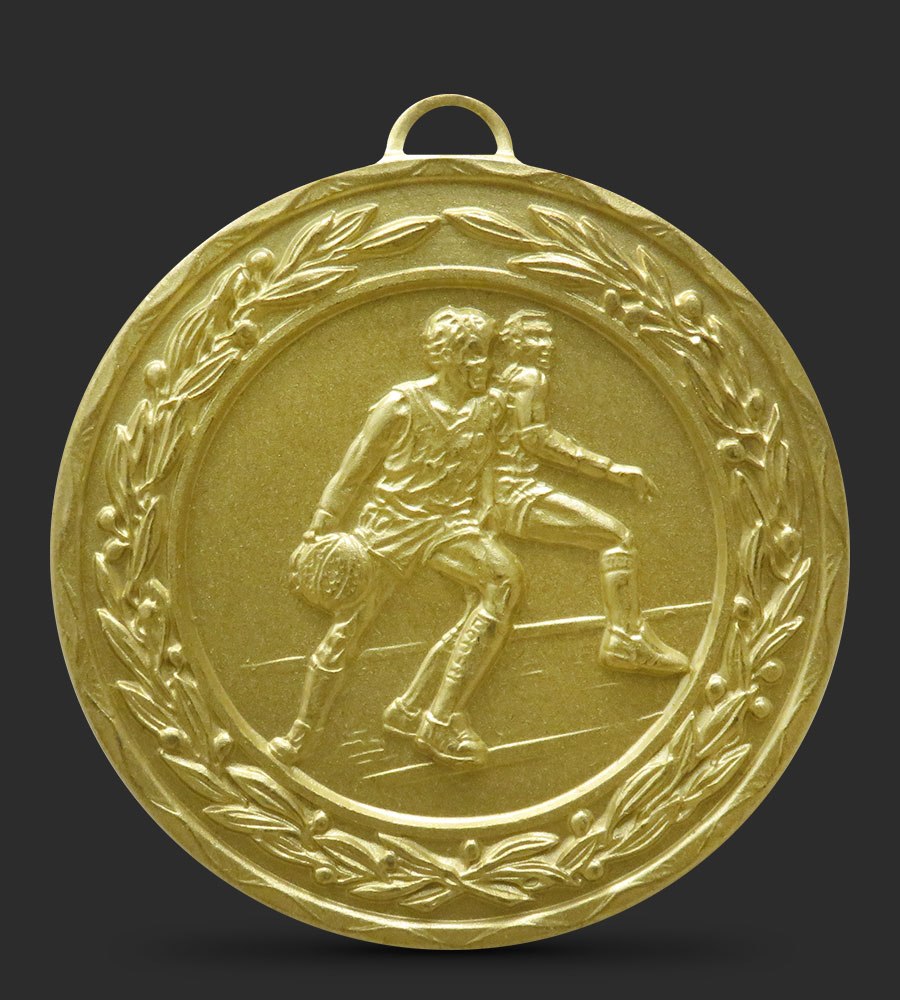 An intricately embossed Basketball medal depicting two basketball players, with a laurel border around the edge of the medal.