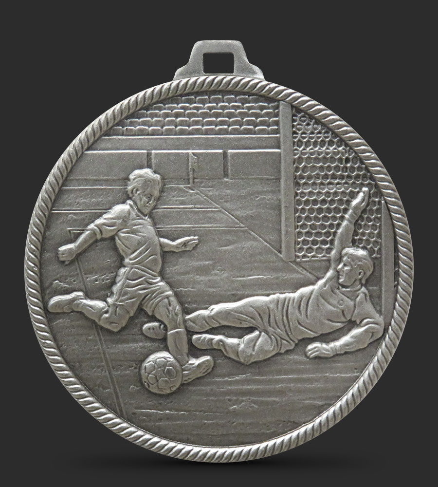 An intricately embossed Football medal depicting a player and goalkeeper, with a laurel border around the edge of the medal.