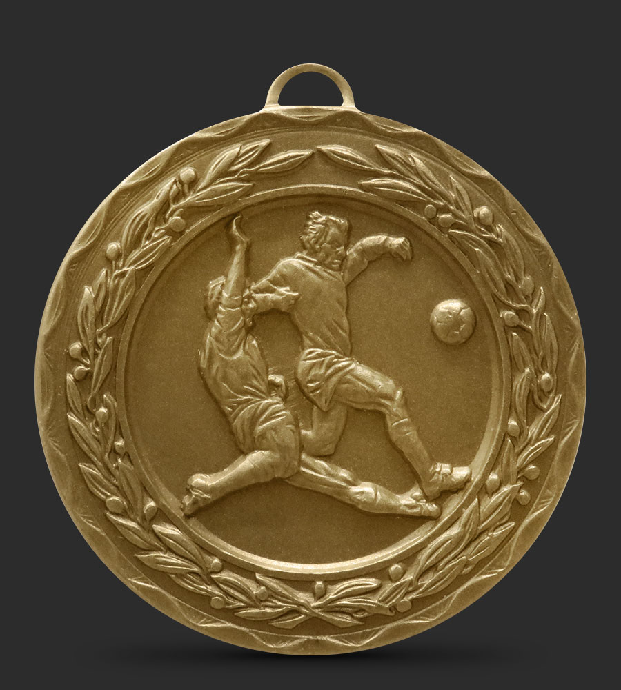 An intricately embossed Football medal depicting two football players in a sliding tackle, with a laurel border around the edge of the medal.