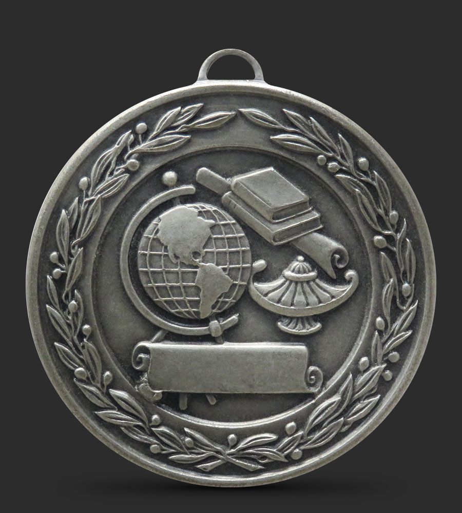 An intricately embossed Knowledge medal depicting a globe, scroll, books and lamp of learning, with a laurel border around the edge of the medal.