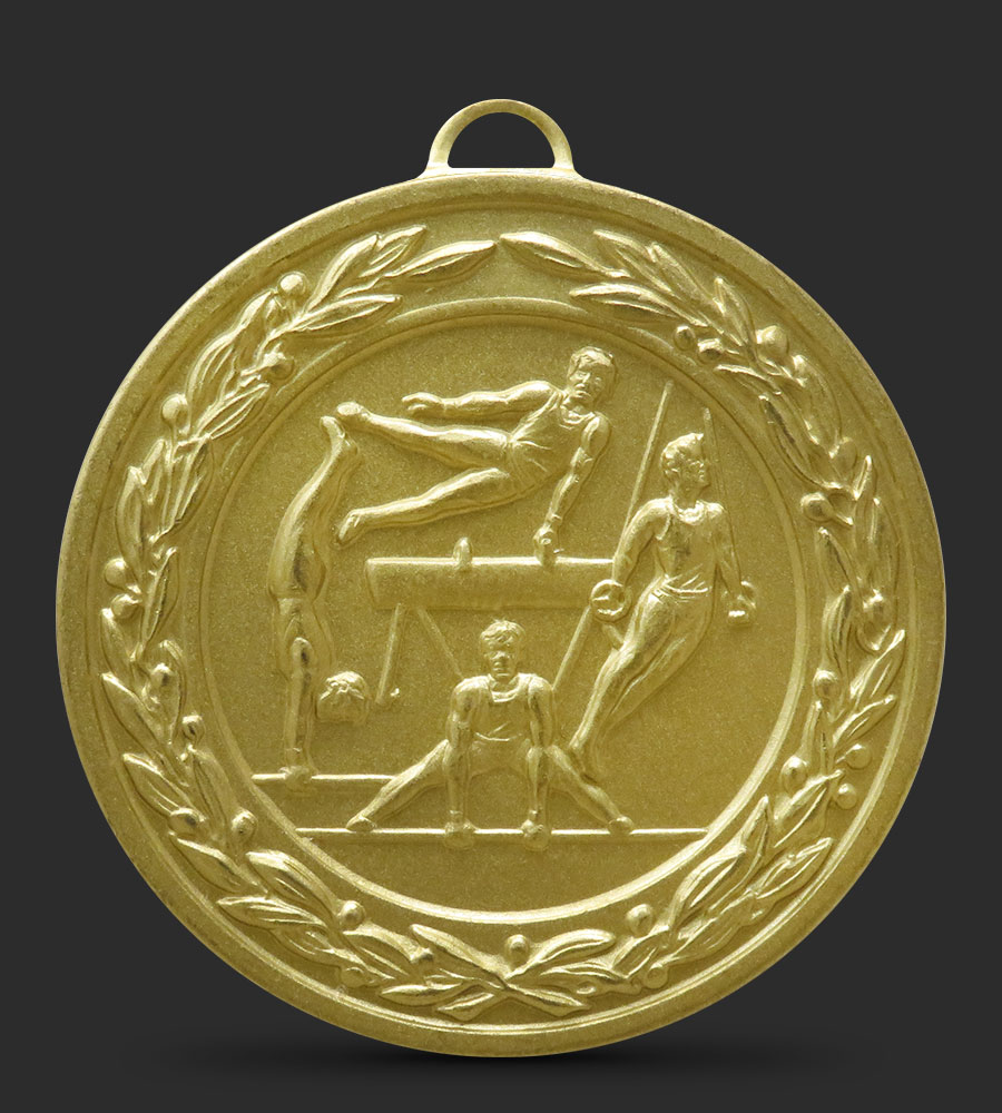 An intricately embossed Gymnastics medal depicting a make gymnast, with a laurel border around the edge of the medal.