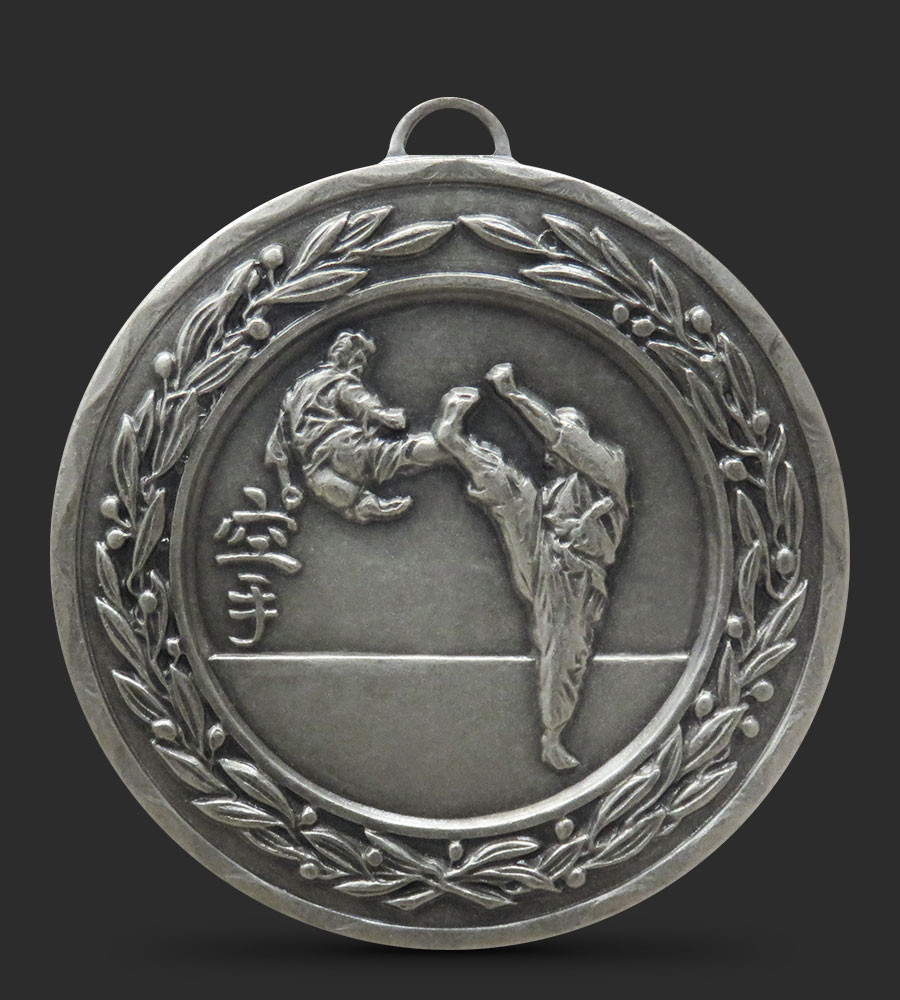 An intricately embossed Martial Arts medal depicting competitors kicking and blocking each other, with a laurel border around the edge of the medal.