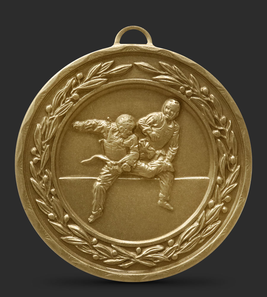 An intricately embossed Martial Arts medal depicting a competitor kicking at an opponent, with a laurel border around the edge of the medal.