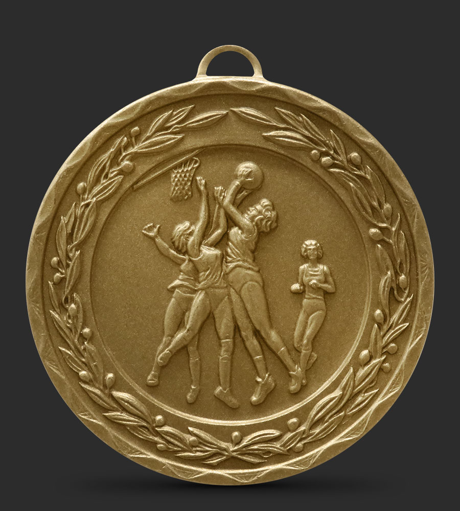 An intricately embossed Female Basketball medal depicting basketball players jumping up at a net, with a laurel border around the edge of the medal.