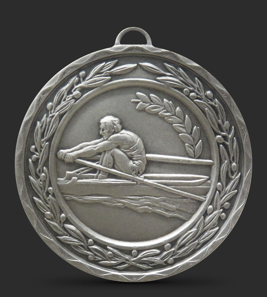 An intricately embossed Rowing medal depicting a rower on a boat, with a laurel border around the edge of the medal.