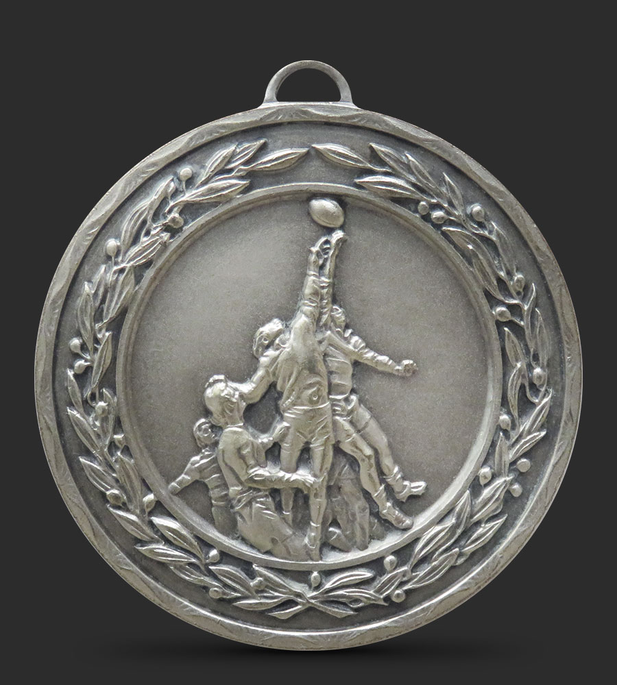 An intricately embossed Rugby medal depicting several players taking part in a lineout, with a laurel border around the edge of the medal.