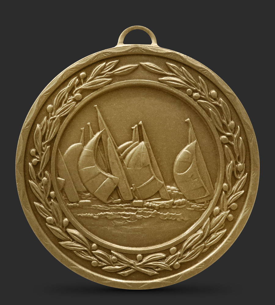 An intricately embossed Sailing medal depicting several sailing boats, with a laurel border around the edge of the medal.