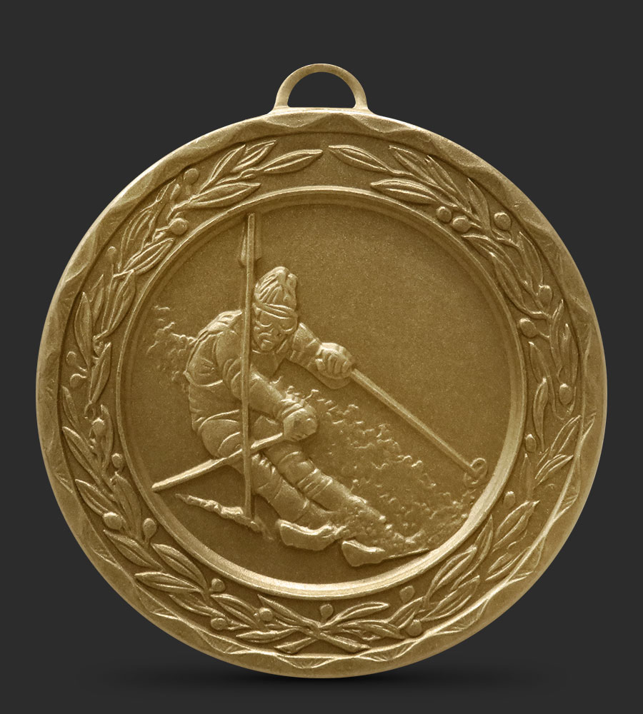 An intricately embossed Skiing medal depicting a skier skiing around a pole, with a laurel border around the edge of the medal.