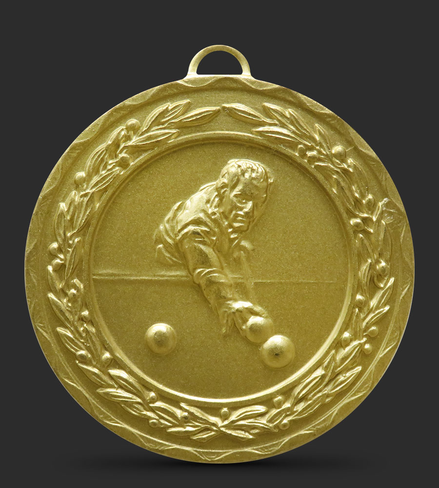 An intricately embossed Snooker medal depicting a snooker player lining up a shot, with a laurel border around the edge of the medal.