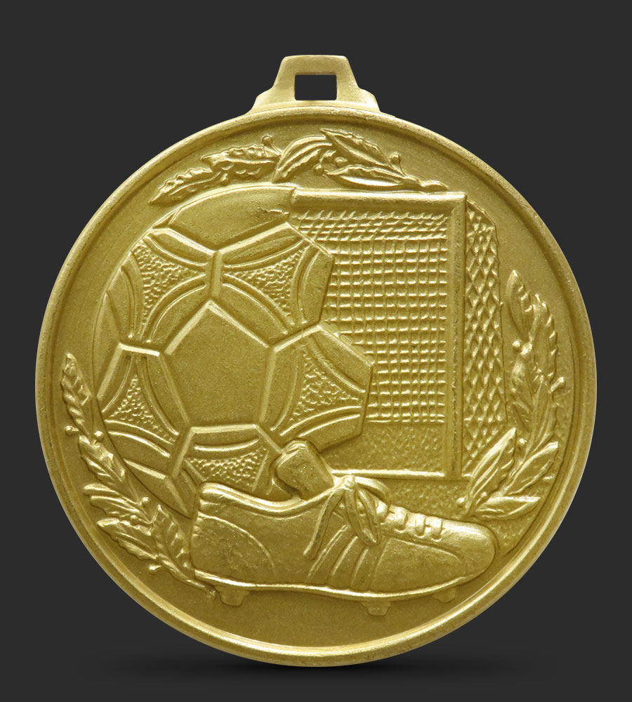 An intricately embossed Football medal depicting a football, football boot and goal, with laurel leaves around the edge of the medal.