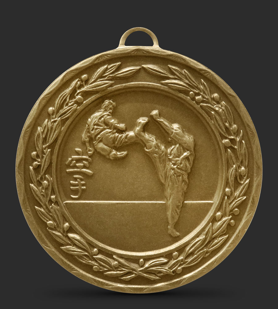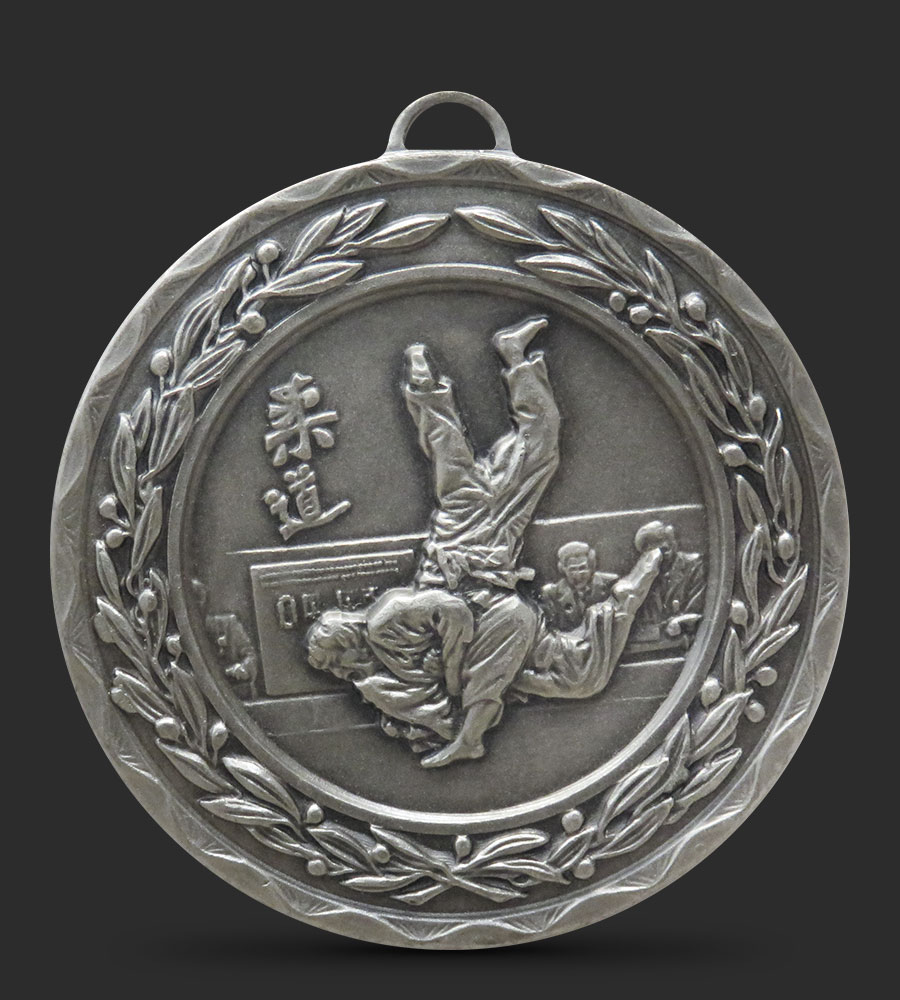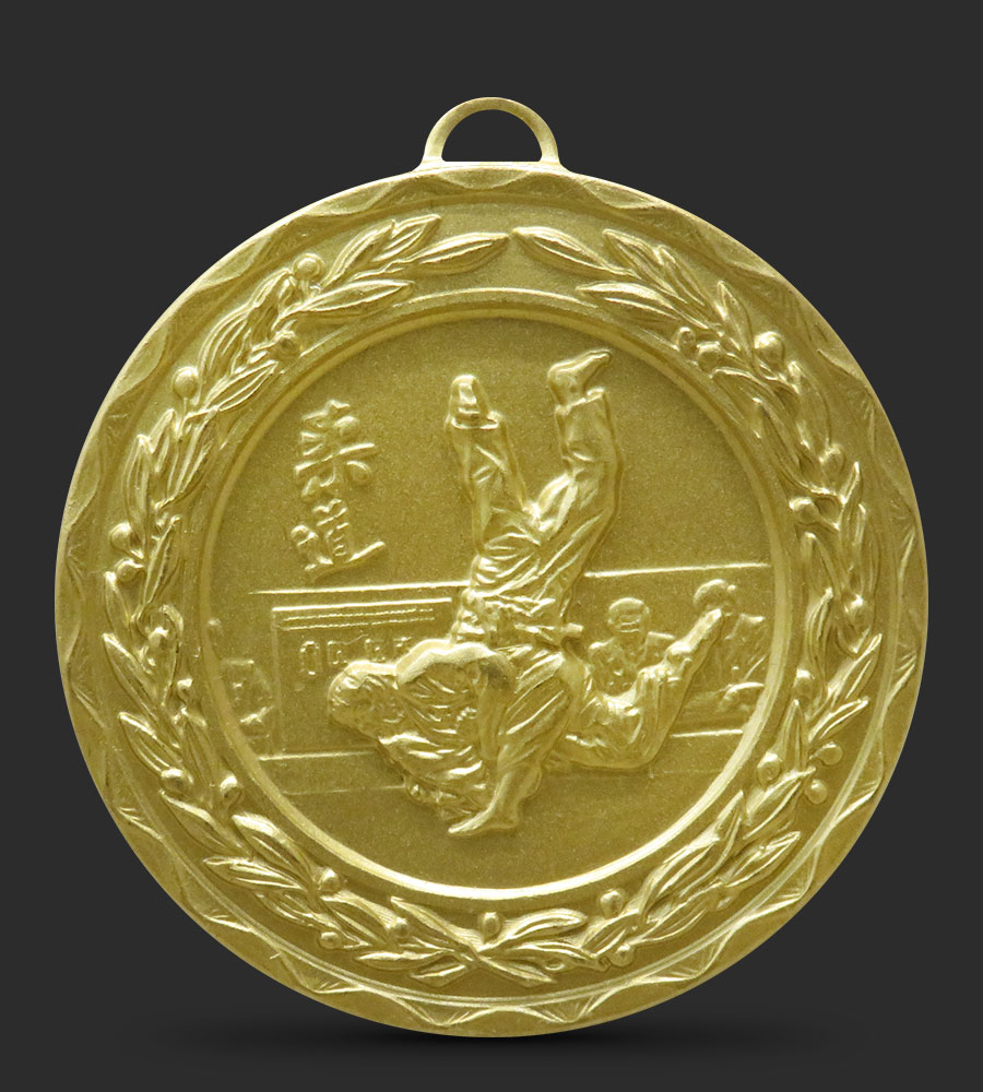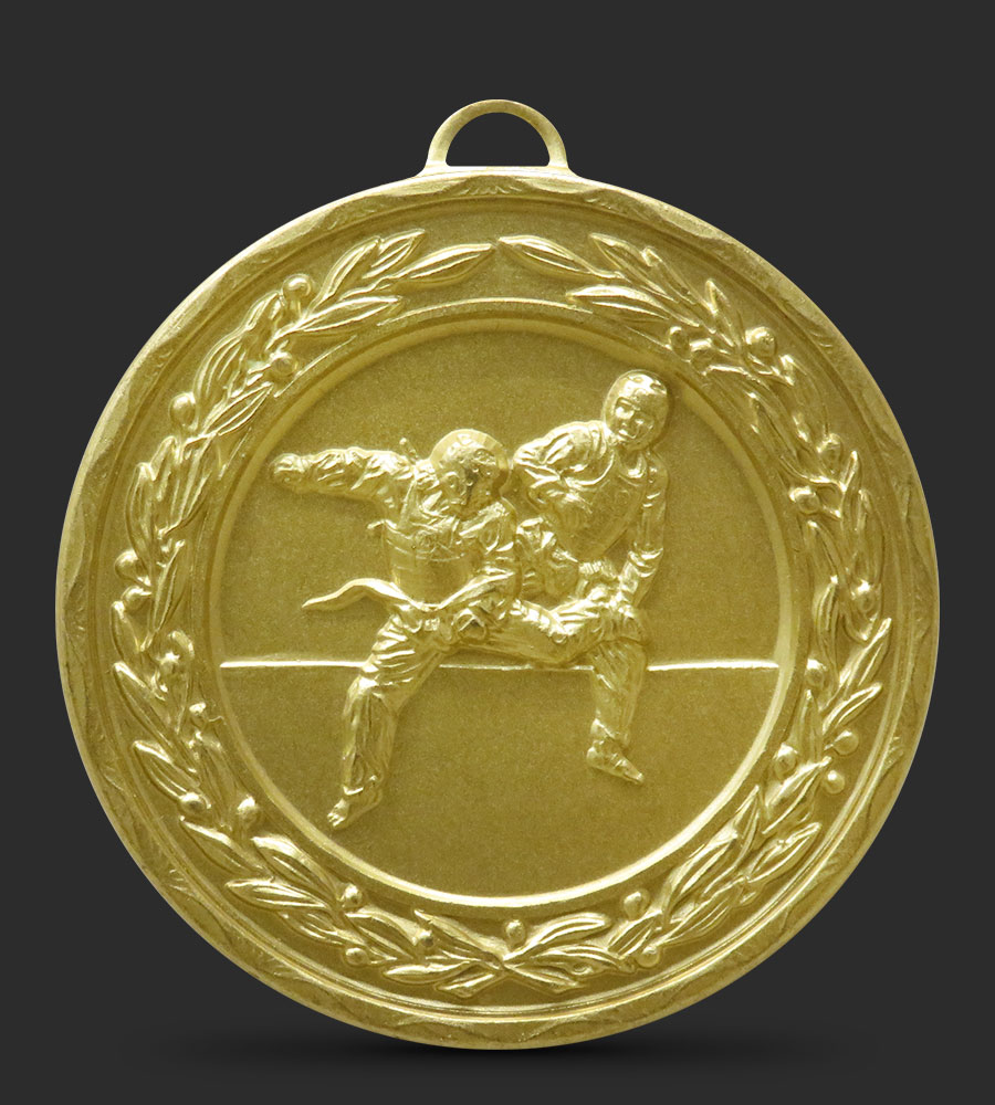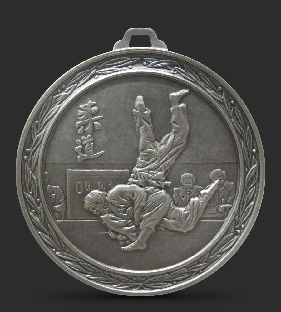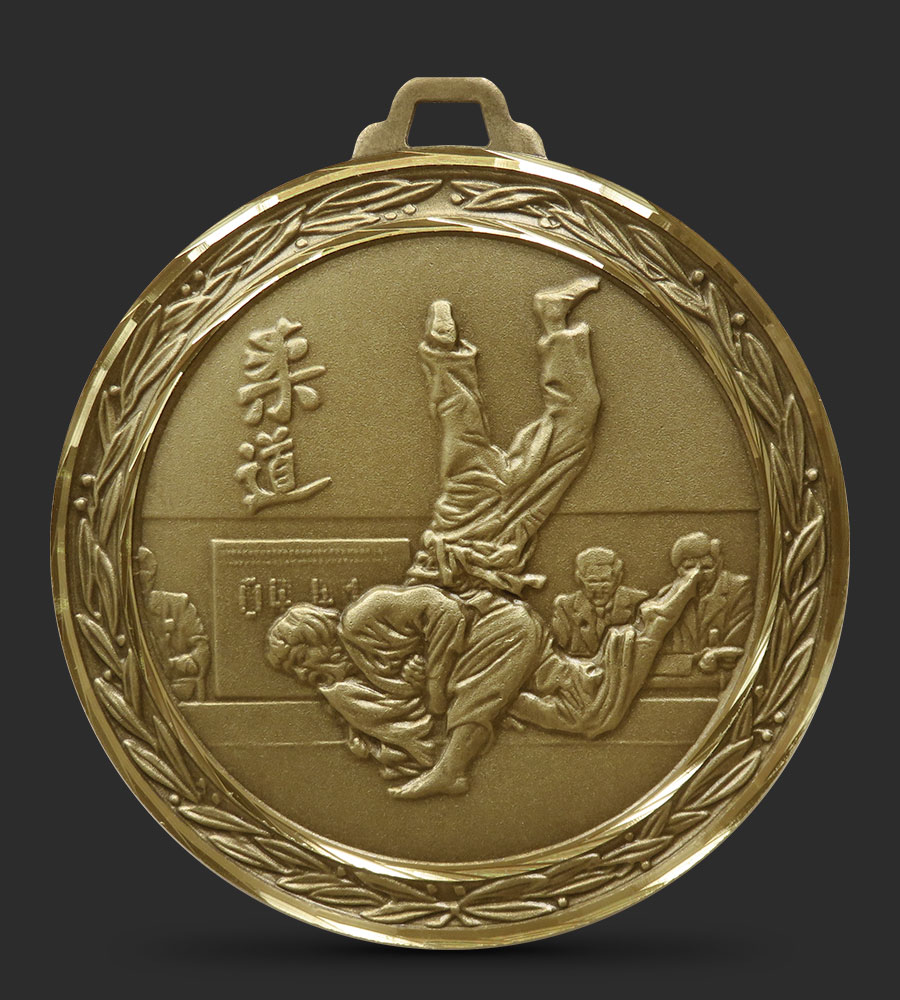 An intricately embossed Martial Arts medal depicting a competitor throwing their opponent to the floor, judges and a scoreboard in the background, with a laurel border around the edge of the medal.