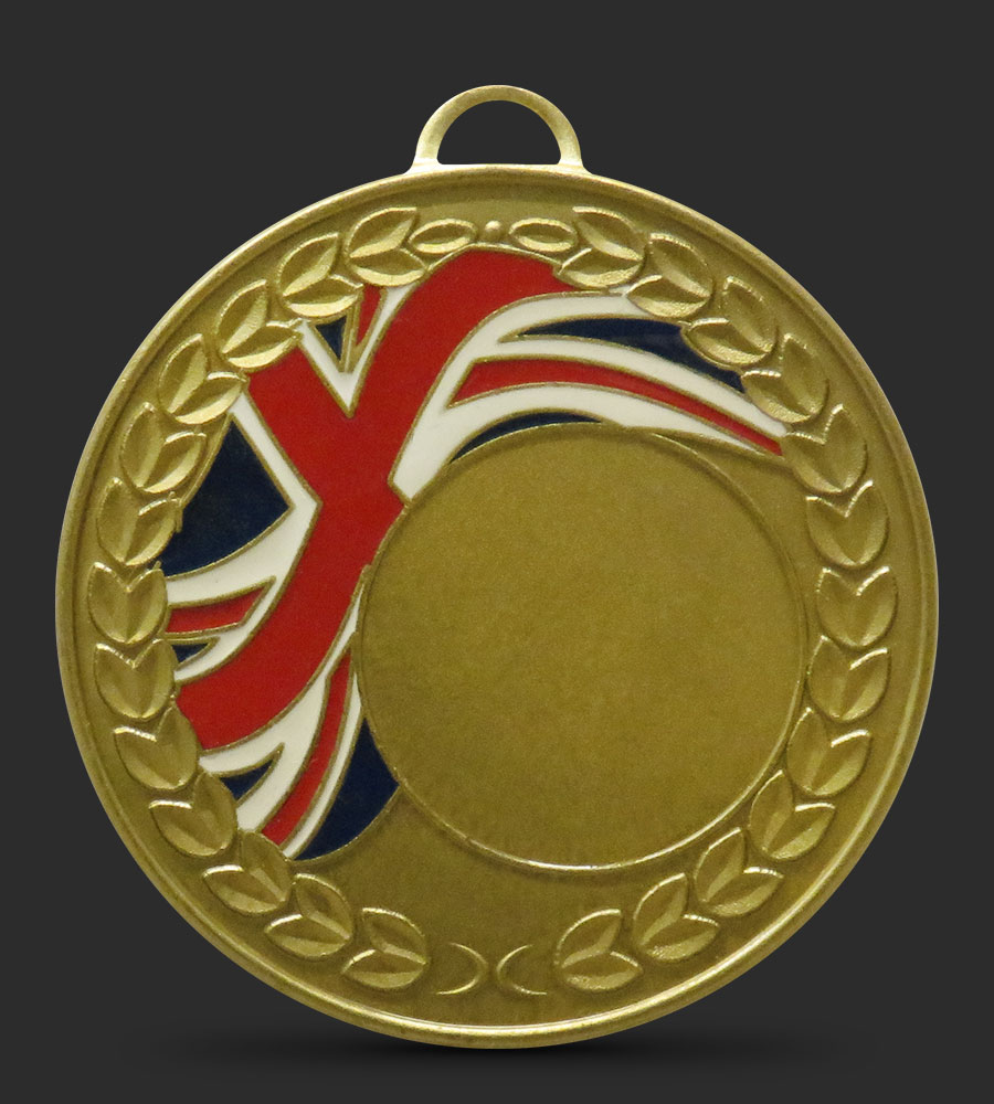 An intricately embossed enamelled Union Flag Centre Holder medal with a 1″ recess suitable for a centre.