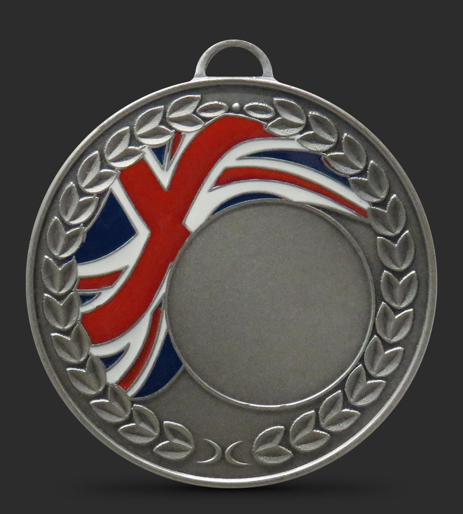 An intricately embossed enamelled Union Flag Centre Holder medal with a 1″ recess suitable for a centre.