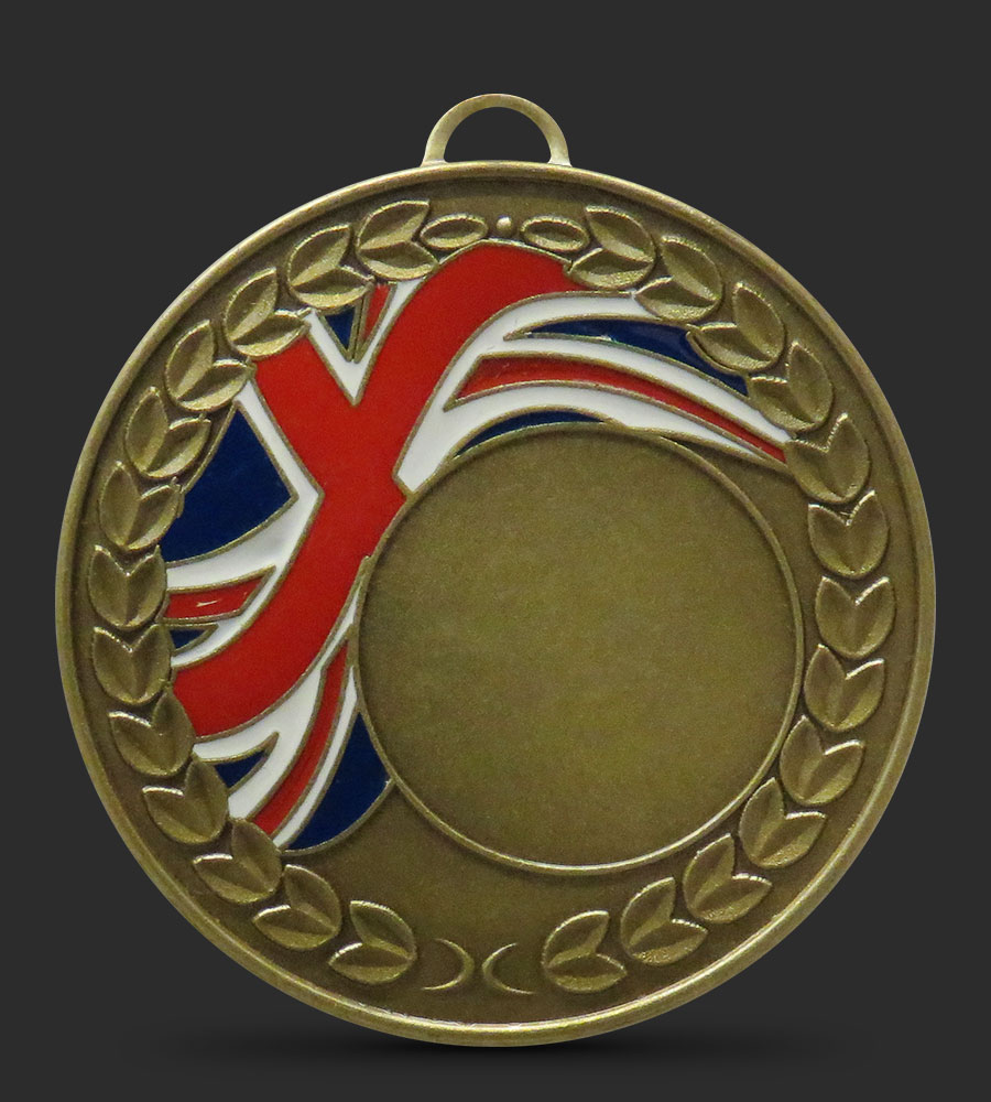 An intricately embossed enamelled Union Flag Centre Holder medal with a 1″ recess suitable for a centre.